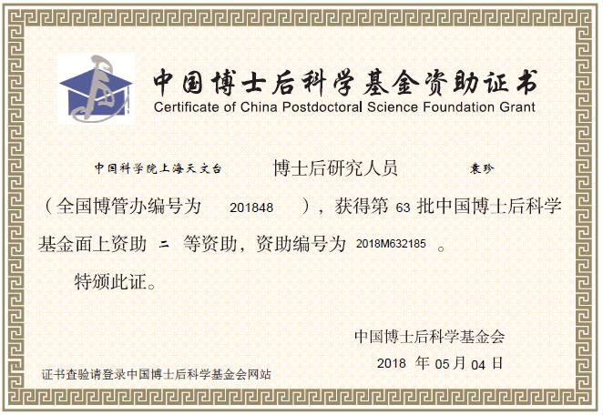 近期,中国博士后科学基金会公布了中国博士后科学基金第63批面上资助人员名单,我台博士后袁珍获得面上二等资助。
